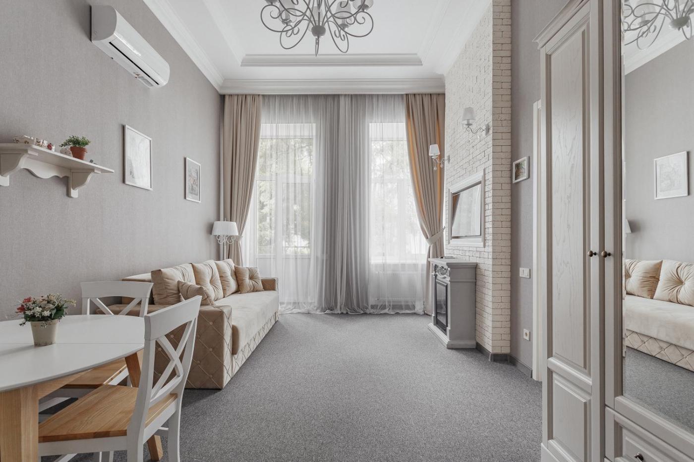Superior Apartment. This apartments special feature is the fireplace. This apartment consists of 1 living room, 1 separate bedroom and 1 bathroom with a bath or a shower and free toiletries. Guests can make meals in the kitchen that is equipped with a stovetop, a refrigerator, kitchenware and a microwave. The apartment provides air conditioning, a washing machine, soundproof walls, a wardrobe and a flat-screen TV with cable channels. The unit offers 2 beds. ;