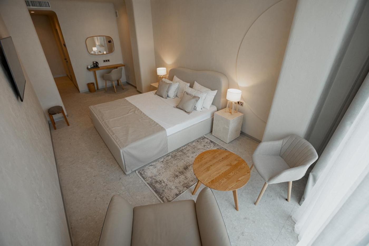 Deluxe Double Room. Providing free toiletries and bathrobes, this double room includes a private bathroom with a walk-in shower, a bidet and a hairdryer. The spacious air-conditioned double room provides a flat-screen TV with cable channels, soundproof walls, a minibar, a tea and coffee maker as well as sea views. The unit offers 1 bed. ;