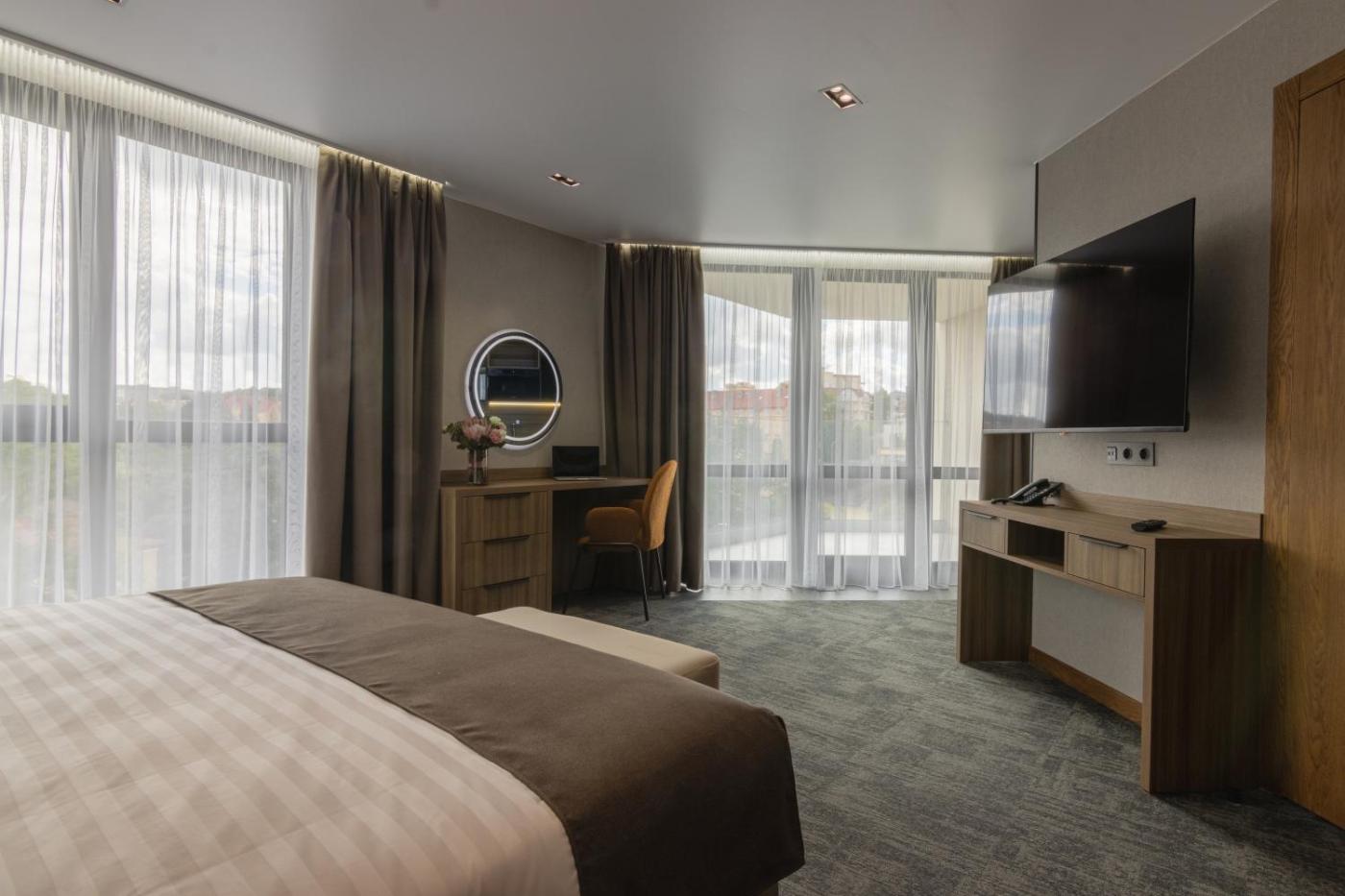 Superior Double Room. The spacious double room offers air conditioning, a tea and coffee maker, as well as a private bathroom boasting a walk-in shower and a hairdryer. The double room provides a dining area, a wardrobe, heating, a flat-screen TV, as well as city views. The unit has 2 beds. ;